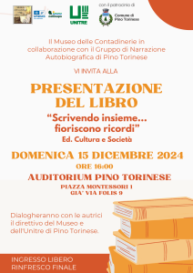 Domenica 15 Dicembre ore 16 presso l’Auditorium di Pino Torinese, Il Museo delle Contadinerie vi invita alla presentazione del libro ” Scrivendo insieme… fioriscono ricordi ” a cura del Gruppo di narrazione autobiografica dell’Unitrè di Pino Torinese, EDIZIONI CULTURA E SOCIETÀ.