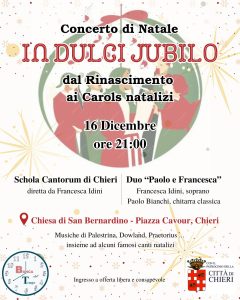 Concerto “In dulci jubilo – dal Rinascimento ai Carols natalizi”: si terrà il 16 dicembre alle ore 21:00 presso la Chiesa di San Bernardino a Chieri.