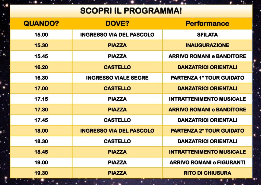 100 figuranti, 21 postazioni, street food dell’epoca, laboratori per i più piccoli, 2 tour guidati, centurioni a cavallo e molto altro…