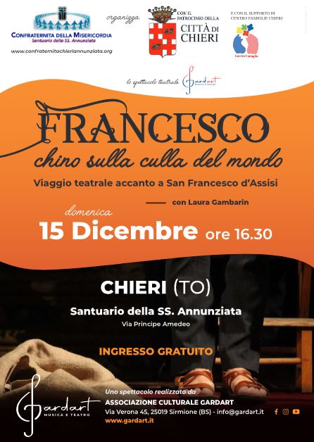 Domenica 15 dicembre alle ore 16,30 nel Santuario SS. Annunziata di Chieri la compagnia GardArt presenta lo spettacolo teatrale “Francesco, chino sulla culla del mondo”, organizzato dalla Confraternita della Misericordia: un dialogo-monologo su questo uomo libero e vero rivoluzionario, che amava definirsi “madre” dei suoi fratelli e che, con quella stessa amorevolezza di madre, si è chinato verso il mondo intero, un mondo fatto di uomini-bambini, impreparati a vivere, deboli di fronte alla forza devastante della vita.