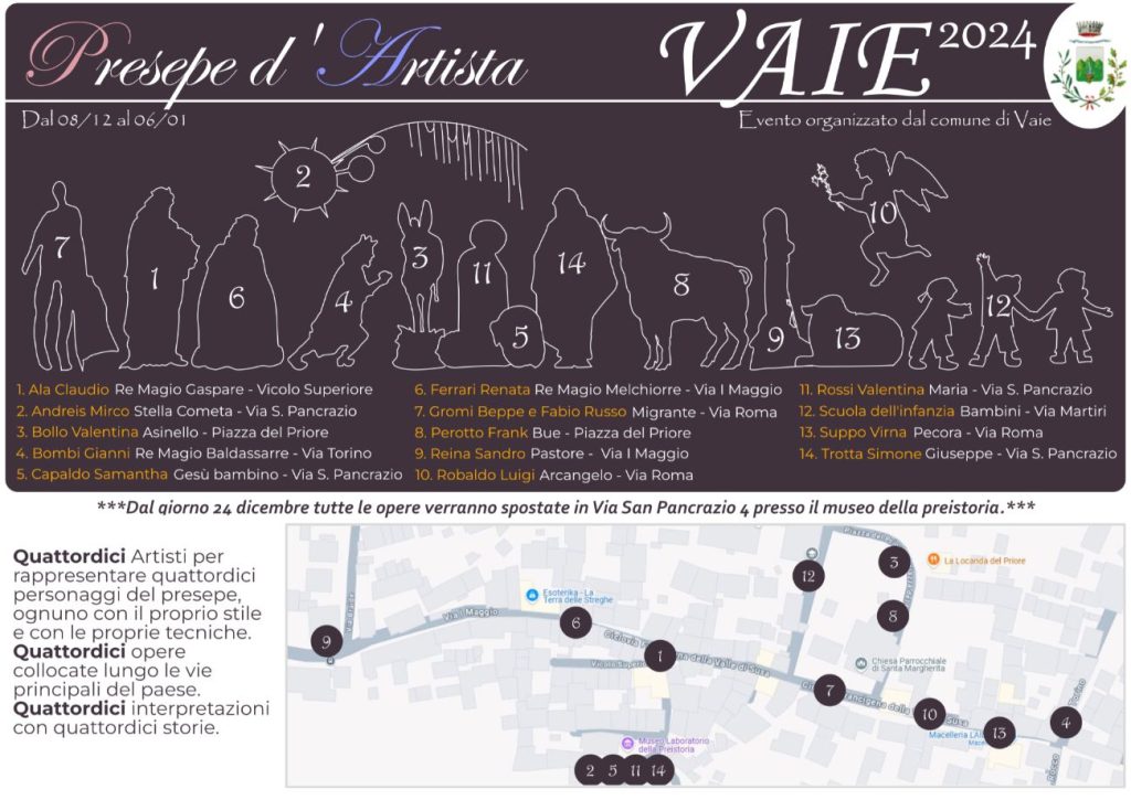 Grande successo per “Presepe d’Artista”, l’iniziativa promossa dall’amministrazione comunale di Vaie e curata dal consigliere e artista Simone Trotta.Iniziativa alla prima edizione nata con l’obiettivo di unire la Comunità nel presentare l’accoglienza del paese in una tipica atmosfera natalizia, con il coinvolgimento di artisti provenienti da tutta la Val Susa e dalla provincia di Torino: Claudio Ala, Mirco Andreis, Valentina Bollo, Gianni Bombi, Samantha Capaldo, Renata Ferrari, Beppe Gromi e Fabio Russo, Francesco Perotto, Sandro Reina, Luigi Robaldo, Valentina Rossi, Virna Suppo e Simone Trotta a cui si sono uniti i bimbi della scuola dell’infanzia di Vaie.Da domenica 8 dicembre la natività è collocata al Museo della Preistoria , mentre gli altri personaggi sono dislocati lungo la via centrale del paese, vicino ad ogni opera è collocata una immagine infografica che guida i visitatori lungo il percorso. Ogni artista attraverso la realizzazione dell’opera racconta il personaggio con creatività donando ai visitatori anche un messaggio di riflessione sul tempo che si sta vivendo.Lunedì 23 dicembre tutti i personaggi che animano vie e piazze verranno spostati nel piazzale del Museo della Preistoria dando vita ad un presepe vero e proprio, e alle 16.30 sarà inaugurato ufficialmente alla presenza degli artisti e del Sindaco Enzo Merini Simone Trotta entusiasta racconta: “Quattordici Artisti per rappresentare quattordici personaggi del presepe, ognuno con il proprio stile e con le proprie tecniche. Quattordici opere collocate lungo le vie principali di Vaie per dar vita a quattordici interpretazioni con quattordici storie. In questo periodo dell’anno in cui troppe luci allegre, colorate e lampeggianti vengono appese noncuranti di ciò che accade nel mondo, è nata l’iniziativa a Vaie di promuovere un presepe fatto da artisti e che lasciasse loro libera l’interpretazione dei personaggi che sarebbero andati a rappresentare.Non è stato imposto nessun vincolo o linea guida, nessuna interferenza sul concepimento delle opere, unica regola “non offendere”. È così è stato. Quattordici opere nate dalla fantasia di quattordici artisti realizzate per portare un po’ di arte in un momento in cui c’è bisogno di più cultura e meno violenza, quattordici opere per la prima edizione del “Presepe d’Artista” a Vaie.”