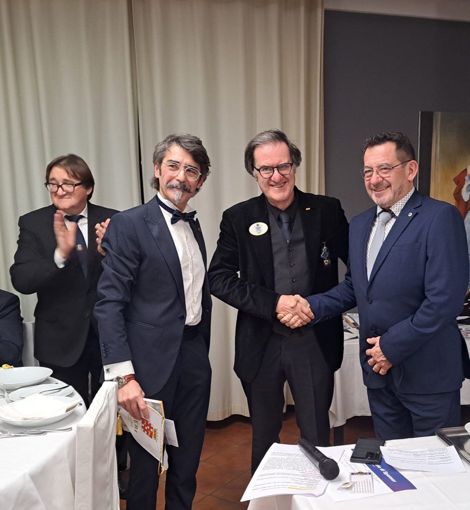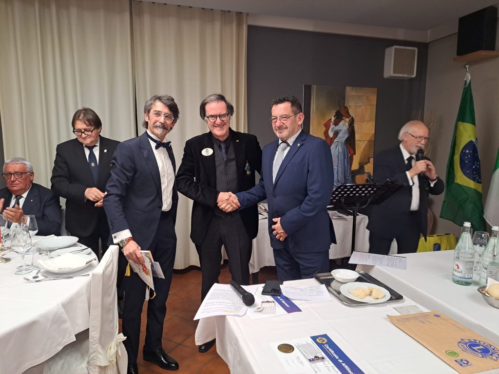 Nelle foto: momenti della serata, con il nuovo socio, il governatore distrettuale, il presidente del club Alberto Cagliero e il cerimoniere Claudio Campagnolo