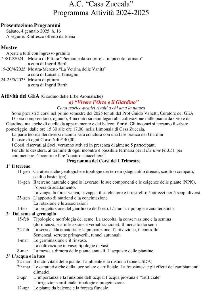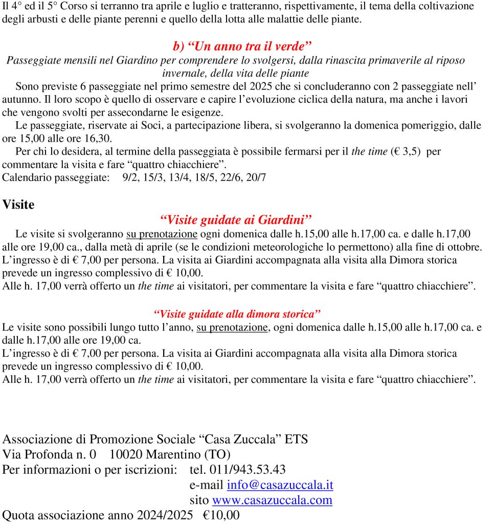 Spiega Guido Vanetti, Presidente dell’ APS “Casa Zuccala” ETS: In questi ultimi tempi l’opinione pubblica è stata ripetutamente sollecitata dai mezzi di comunicazione di massa a prendere coscienza degli effetti negativi dei cambiamenti climatici o di quelli apparentemente positivi: caldo anomalo- tutti al mare; precipitazioni fuori stagione- tutti a sciare. Il sottoscritto, che da qualche anno si è rifugiato nell’universo delle piante e passa più tempo a parlare con loro (non “esse”) che con gli umani, pensa di notare, in questo fenomeno, un’osservazione di quanto accade da una prospettiva soggettiva ed un poco egocentrica, quasi che tutto l’universo si muova e muti esclusivamente in funzione dell’uomo: esonda un fiume- danno all’agricoltura, si scatena un terremoto-danni alle abitazioni, perdura la siccità-difficoltà all’approvvigionamento idrico per le abitazioni. In realtà i mutamenti climatici, che con preoccupazione stiamo osservando, influiscono prioritariamente sulla vita della natura, sulle condizioni di vita e sulla salute dei vegetali e degli animali, sui loro tentativi di adattarsi alle nuove esigenze e solo secondariamente sull’uomo e sulle sue strutture agricole e insediative.Per questi motivi l’Associazione “Casa Zuccala” che cura il Gea (Giardino delle Piante Aromatiche) di Marentino ha pensato di aprire i suoi spazi per un’iniziativa che speriamo venga accolta positivamente: permettere a tutti coloro che si interessano dei problemi della natura, di poter osservare, con visite periodiche, non solo i Giardino nel momento del suo massimo sviluppo, tra la tarda primavera e l’estate, bensì tutto l’anno, seguendo mese per mese la vita delle piante, dal germogliare dei semi alla raccolta dei frutti, ed osservando anche i lavori e gli interventi che vengono fatti per favorire questi processi, messi in difficoltà dalle avversità di recente sviluppo.”