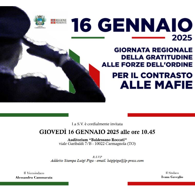 La Città di Carmagnola rinnova il suo impegno nella celebrazione della “Giornata Regionale di gratitudine alle forze dell’ordine per il contrasto alle mafie”, istituita dalla Regione Piemonte per rendere omaggio alle donne e agli uomini che si dedicano con coraggio e determinazione alla lotta contro la criminalità organizzata.