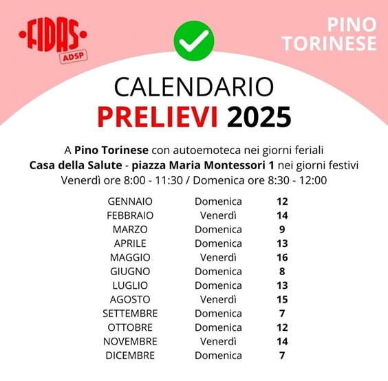 Qui il calendario prelievi 2025 del gruppo Fidas di Pino Torinese.