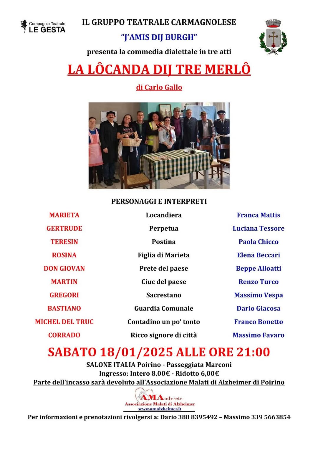 POIRINO. Sabato 18 gennaio “La Locanda dij ttre merlo” al Salone Italia.