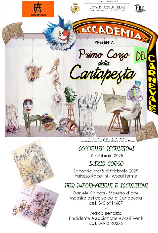 “Quando l’Associazione di promozione sociale Acquieventi APS (già Comitato Amici del Carnevale di Acqui) ha proposto di organizzare questo corso, abbiamo accolto con favore questa idea, pensandola come un primo passo di un progetto potenzialmente più ampio e stabile. – hanno dichiarato il Sindaco di Acqui Terme dott. Danilo Rapetti Sardo Martini e l’Assessore alla Cultura dottor Michele Gallizzi – Abbiamo consultato inizialmente l’Istituto Parodi, poiché presenta una realtà formativa importante nell’ambito artistico come quella del Liceo d’Arte, che nella persona della Dirigente prof.ssa Silvia Miraglia ha espresso il suo assenso senza riserve, abbiamo pensato di aprire questo corso a tutti i ragazzi delle scuole superiori gratuitamente e di renderlo altresì accessibile anche a soggetti esterni alle Istituzioni scolastiche”.