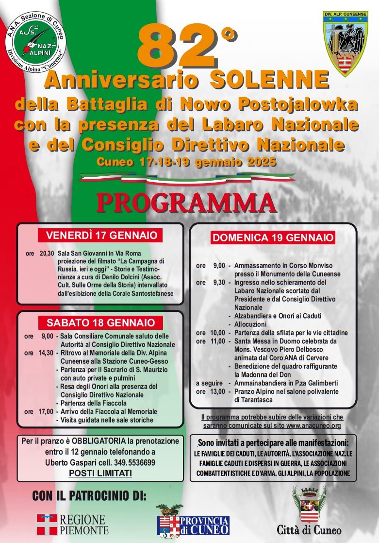 Nel fine settimana sono previsti in città una serie di eventi (in allegato il programma completo n.d.r.) per commemorare l’82° anniversario della battaglia di Nowo Postojalowka, in ricordo del sacrificio degli Alpini della Cuneense avvenuto in Russia nel gennaio del ‘43. La Divisione venne praticamente annientata, con il doloroso primato di quasi 14mila tra morti e dispersi sui 15mila partiti l’anno precedente dalla stazione di Cuneo.
