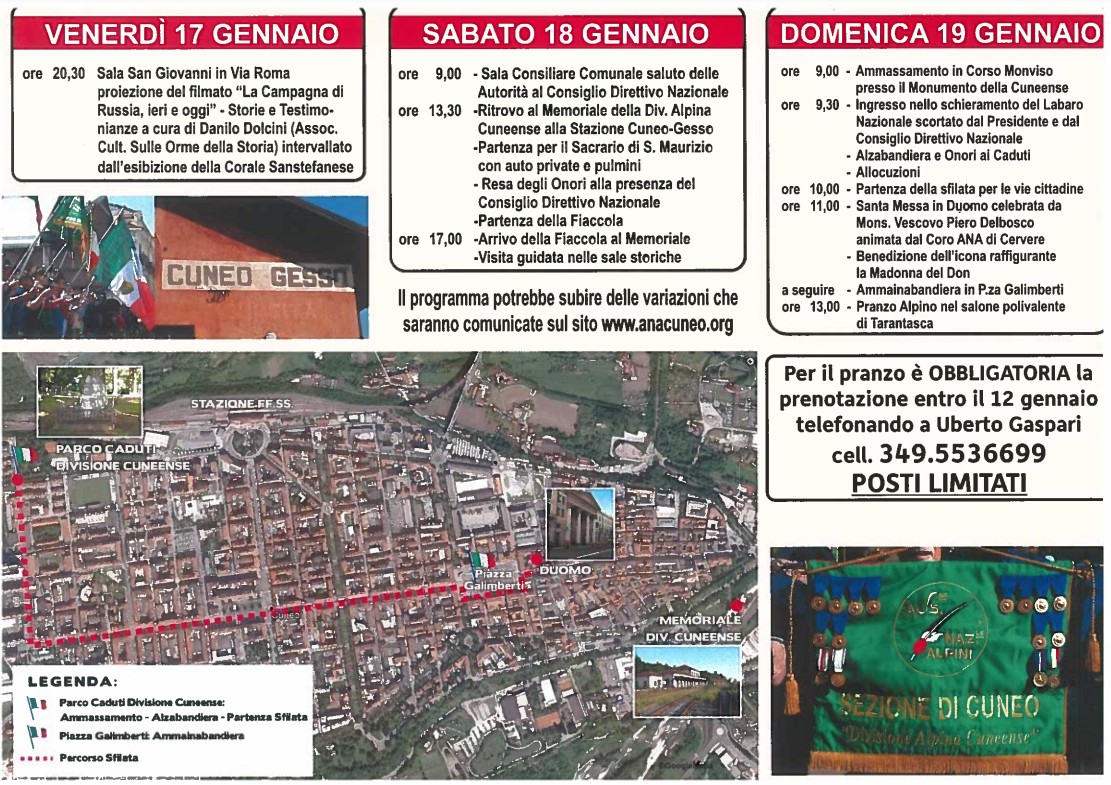 L’evento più rilevante è previsto domenica 19 gennaio, quando si terrà una sfilata degli Alpini per le vie di Cuneo. Il corteo partirà alle 10 dal parco Monviso e attraverserà l’asse centrale della città, giungendo davanti alla Cattedrale di Santa Maria del Bosco, in via Roma (dove sarà celebrata una funzione religiosa). Per garantire la sicurezza di tutti i partecipanti e il regolare svolgimento della manifestazione, saranno adottate le seguenti modifiche alla viabilità cittadina.