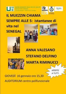“Il muezzin chiama sempre alle 5: istantanee di vita nel Senegal”. Interverranno Anna Valesano, Marta Riminucci e Stefano Delfino.