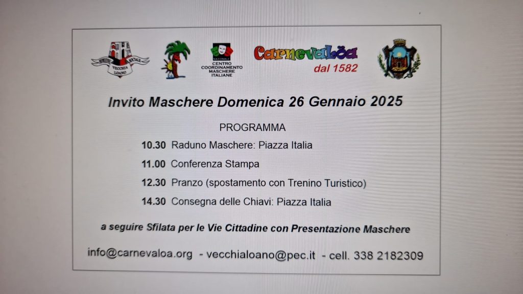 LOANO . Domenica 26 gennaio  “Raduno Maschere e sfilata per le vie cittadine”.