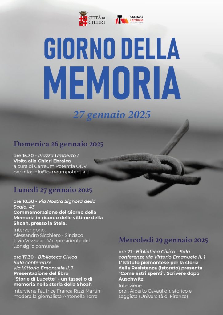 Segnaliamo inoltre che domenica 26 gennaio, alle ore 15.30, l’Organizzazione di volontariato culturale Carreum Potentia organizza la Visita alla Chieri Ebraica, con partenza da piazza Umberto I.