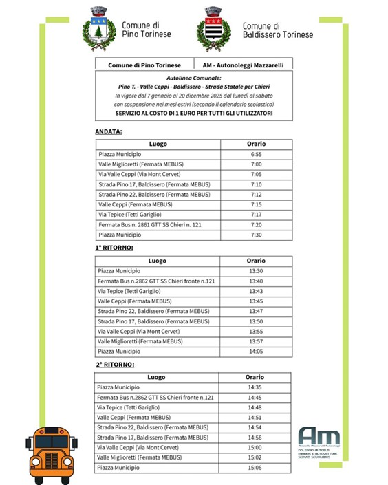 È ripreso il 7 gennaio 2025 il servizio comunale di collegamento tramite navetta tra Pino Torinese centro, Valle Ceppi e Baldissero.