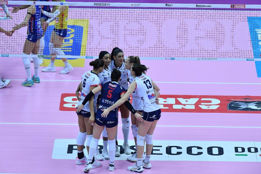 Prosecco Doc Imoco Conegliano-Reale Mutua Fenera Chieri ’76 3-0 (25-18; 25-19; 25-17) PROSECCO DOC IMOCO CONEGLIANO: Wolosz, Haak 18, Chicichella 6, Fahr 14, Gabi 8, Lanier 12; De Gennaro (L); Seki, Lubian 2, Adigwe 1. N. e. Zhu, Eckl, Lukasik, Bardaro (2L). All. Santarelli; 2° Barbato. REALE MUTUA FENERA CHIERI ’76: Van Aalen, Gicquel 14, Zakchaiou 2, Gray 8, Skinner 10, Omoruyi 2; Spirito (L); Guiducci, Anthouli 2, Buijs 2, Alberti 1, Rolando. N. e. Lyasko, Bednarek (2L). All. Bregoli; 2° Rostagno. ARBITRI: Cerra e Chiriatti. NOTE: presenti 5344 spettatori. Durata set: 23′, 28′, 24′. Errori in battuta: 10-9. Ace: 5-3. Ricezione positiva: 60%-48%. Ricezione perfetta: 43%-38%. Positività in attacco: 52%-38%. Errori in attacco: 3-2. Muri vincenti: 11-4. MVP: Fahr.