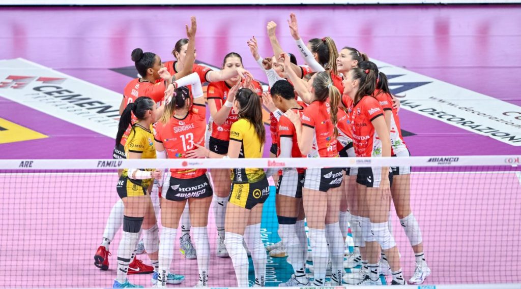 La CDA Talmassons FVG sfata il tabù Latisana, trionfando contro Pinerolo per 3-0 e conquistando tre punti di importanza capitale per rilanciarsi nella corsa alla salvezza, Coach Barbieri sceglie lo starting six composto da Eze al palleggio, Storck opposta, Pamio e Strantzali schiacciatrici, Kocic e Botezat centrali con Ferrara libero Primo set che vede la CDA Talmassons FVG partire con una marcia in più, sfruttando la spinta del pubblico che ancora una volta risponde presente. Subito un break importante, con le friulane che grazie alle proprie attaccanti si portano addirittura sul 20-10. Le ospiti tentano una reazione ma il primo parziale è un monologo friulano che si chiude sul 25-13. Secondo set molto più combattuto con le due compagini che si affrontano punto su punto. Smarzek sale in cattedra e guida l’attacco piemontese, ma Eze giostra al meglio la regia smarcando le proprie attaccanti. Break CDA per il 20-17 ma la squadra di coach Marchiaro non molla e ancora Smarzek salva la situazione annullando due set point. 24 pari e si va ai vantaggi, con una lotta al cardiopalma che termina con il muro di Strantzali per il 29-27. Nel terzo set Talmassons riprende da dove aveva iniziato, buon parziale di 8-3 grazie al muro granitico di Botezat. Pinerolo si riporta però a meno due, mettendo a dura prova la retroguardia delle Pink Panthers. Questa volta però le ragazze di coach Barbieri non mollano il colpo, tornando a +4 e mantenendo il vantaggio fino al 20-16. Storck si prende la scena nel finale di set, mettendo a segno due punti fondamentali, per portare la CDA a match point, con la squadra che vince per 25-21 e conquista set e match.