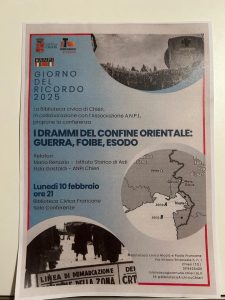 Lunedì 10 febbraio 2025 alle ore 21 in occasione del Giorno del Ricordo presso la sala conferenze delle Biblioteca civica di Chieri si terrà la conferenza dal titolo “I drammi del confine orientale: guerra, foibe, esodo” in collaborazione con l’A.N.P.I. (Associazione Nazionale Partigiani di Italia).