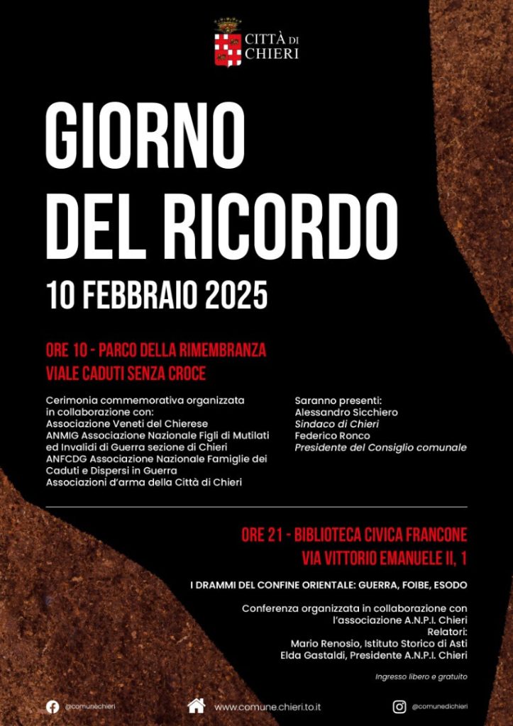 Lunedì 10 febbraio, il Sindaco Alessandro SICCHIERO e il Presidente del Consiglio comunale Federico RONCO presenziano, alle ore 10, al Parco della Rimembranza, alla cerimonia commemorativa organizzata in collaborazione con l’Associazione Veneti Chieresi, l’Associazione Nazionale Figli di Mutilati ed Invalidi di Guerra ANMIG sezione di Chieri, l’Associazione Nazionale Famiglie dei Caduti e Dispersi in Guerra ANFCDG e le Associazioni d’arma della Città di Chieri.