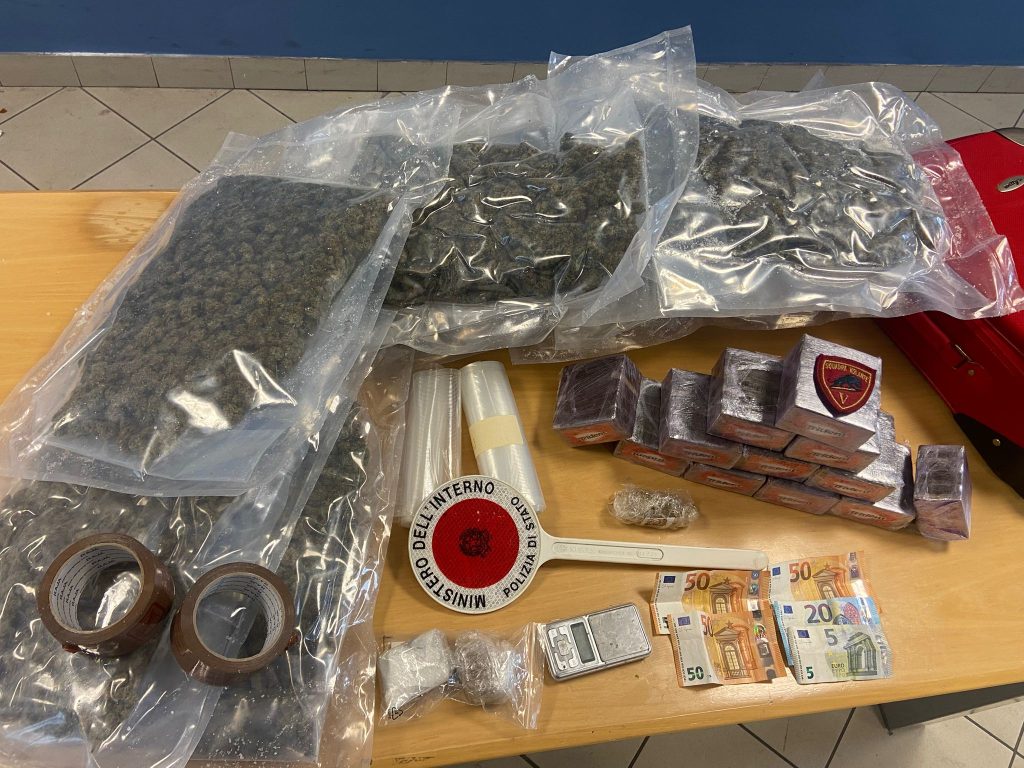 I poliziotti perquisiscono, con l’aiuto di una unità cinofila, anche la sua abitazione dove trovano, nascosti dentro un trolley da viaggio, 4 kg di hashish oltre a un bilancino di precisione e materiale plastico vario utile al confezionamento.