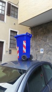 Nel mirino i cassonetti della raccolta rifiuti: alcuni cittadini se li sono trovati sopra le auto e qualcuno addirittura su una tettoia. La polizia locale indaga. (Foto da Facebook)