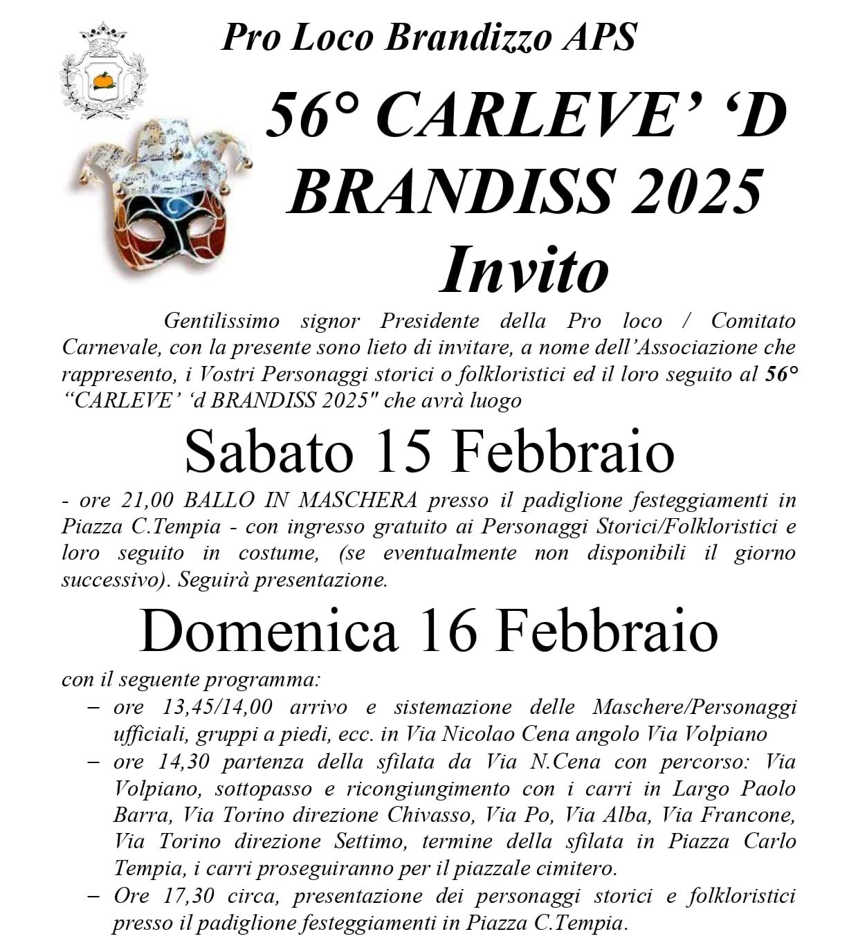 BRANDIZZO. Sabato 15 domenica 16 febbraio “56° CARLEVE’ d’ BRANDISS”
