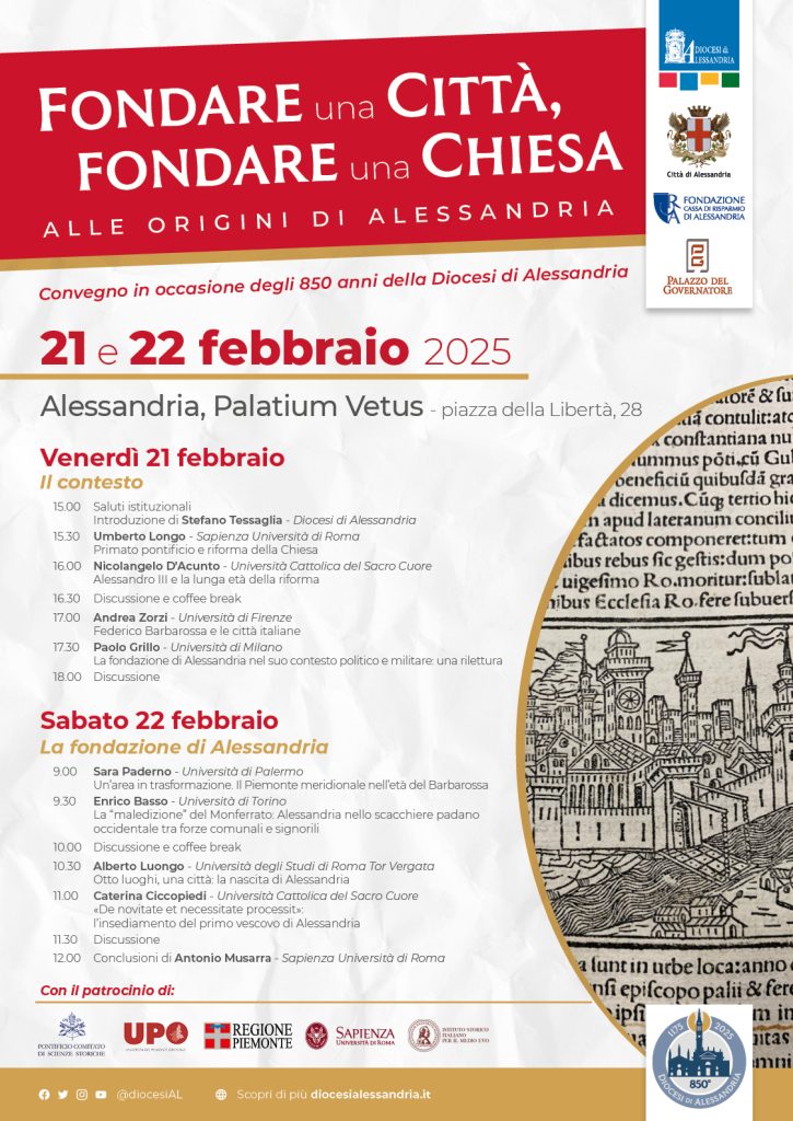 In occasione degli 850 anni della Diocesi di Alessandria (1175-2025), il 21 e 22 febbraio 2025, presso il Palatium Vetus della Fondazione Cassa di Risparmio di Alessandria (Piazza della Libertà 28), si terrà un convegno dal titolo “Fondare una Città, fondare una Chiesa.