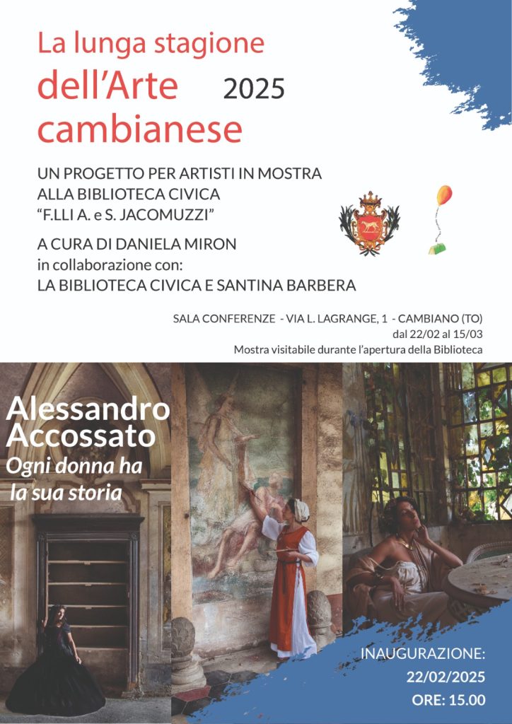 La stagione 2025 della rassegna “La lunga stagione dell’Arte cambianese” prosegue con la mostra “Ogni donna ha la sua storia” del fotografo Alessandro Accossato. La mostra si inaugurera’ il giorno 22 febbraio alle ore 15,00 presso la Sala Conferenze della Biblioteca Civica cambianese in via L. Lagrange num. 1La mostra sara’ visitabile in orari di apertura della Biblioteca fino al giorno 15 marzo 2025.