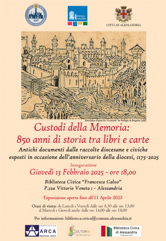 Nel 2025 la Diocesi di Alessandria celebra un traguardo di grande rilevanza per la propria storia: gli 850 anni dalla sua fondazione, avvenuta nel 1175 per volontà di Papa Alessandro III.Per tale occasione, presso le Sale Storiche della Biblioteca Civica, giovedì 13 Febbraio alle ore 18.00, verrà inaugurata la mostra “Custodi della Memoria: 850 anni di storia tra libri e carte”, realizzata in sinergia dalla Diocesi e dalla Città di Alessandria con la Biblioteca Civica ”Francesca Calvo”. La mostra vuole rappresentare un momento di riflessione e riscoperta della fede e della cultura che hanno caratterizzato la Città e la sua comunità.Attraverso un’esposizione che unisce libri antichi e documenti storici conservati presso la Biblioteca del Seminario e l’Archivio capitolare della Cattedrale di Alessandria ad altri appartenenti alle collezioni civiche, il visitatore potrà esplorare secoli di storia, devozione popolare e cultura della città.In questo percorso saranno mostrati, per ciascun fondo, gli esemplari meritevoli di interesse per storia, pregio o rarità, e così valorizzati contestualmente gli ex libris dei possessori e le note manoscritte, le marche tipografiche, le legature di pregio, le carte di guardia di recupero e le immagini ed illustrazioni presenti nei volumi, editi principalmente fra il XVI-XVIII secolo.La mostra costituisce non solo un viaggio nella memoria della Città e Diocesi di Alessandria, ma anche un’opportunità, attraverso i libri e i documenti esposti, di riscoprire la storia di una fede condivisa, vissuta e custodita, che ha contribuito a plasmare l’identità di Alessandria e dei suoi abitanti.