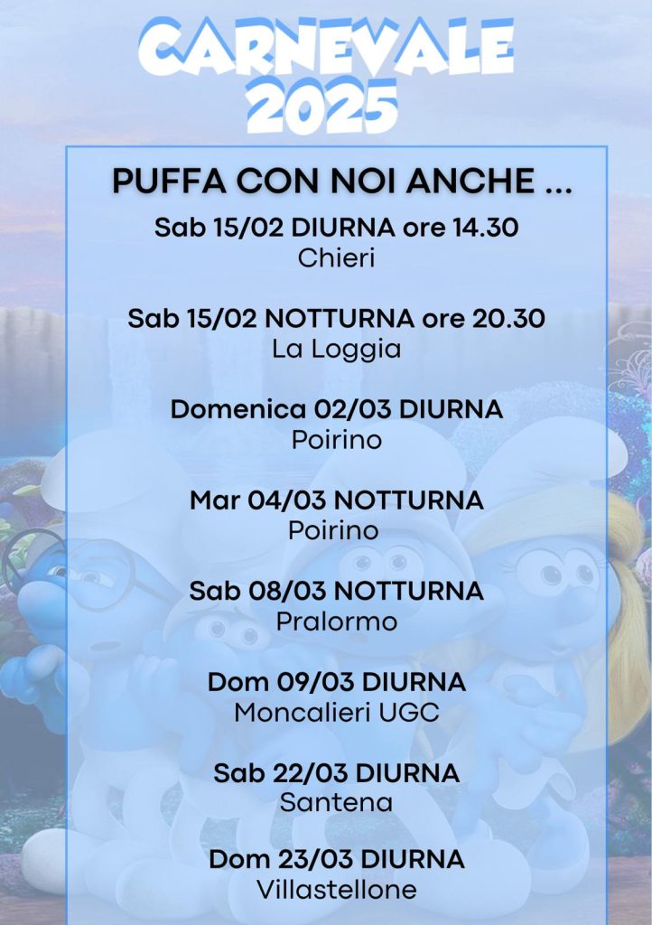 Dopo il debutto nella sfilata della Pro Chieri in programma doman i sabato alle 14,30, il carro chierese dei Puffi, realizzato dagli oratori della cinque parrocchie di Chieri, inizierà un tour partecipando a numerose sfilate nei dintorni.Ecco il programma.