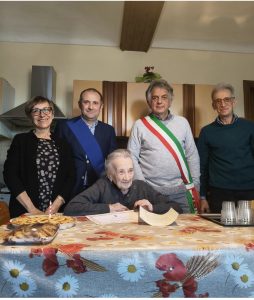 Pierina, nata e residente a Berzano San Pietro, vive nella casa di famiglia accudita dai figli Mario e Paola. A farle visita per consegnare la pergamena autografata dal presidente della Provincia, Maurizio Rasero, sono stati il consigliere delegato dell’ente, Davide Massaglia e il vice sindaco di Berzano, Marco Mondo. L’arzilla centenaria per quarant’anni ha avuto un negozio di merceria a Casalborgone dove ha vissuto con il marito falegname. A distanza di anni si dedica ancora a piccole attività agricole e casalinghe, passando dall’orto alla vigna ai fornelli della cucina di casa. (f. 1)
