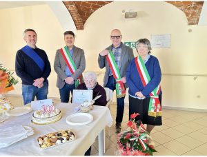 Anna è nata a Rocchetta Tanaro ma, per anni, ha abitato a Rocca d’Arazzo. Ora, dopo una vita di lavori e impegni familiari, si gode un meritato riposo nella struttura residenziale di Montaldo Scarampi. Cent’anni vissuti in semplicità fra le colline dei tre comuni astigiani: è per questo che al saluto e alla consegna dell’attestato sono intervenuti, nell’ordine (da sinistra verso destra), il consigliere delegato della Provincia, Ivan Ferrero, gli amministratori pubblici in carica, il sindaco di Montaldo, Stefano Marchetti; il vice di Rocchetta, Valentino Icardi; la prima cittadina di Rocca d’Arazzo, Laura Fontana (foto 2).