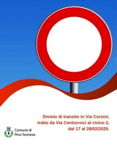 Si comunica che a Pino Torinese è previsto il divieto di transito in Via Corsini, tratto da Via Centocroci al civico 2, dal giorno 17/02/2025 al giorno 28/02/2025, per la realizzazione dei lavori comunali di restauro e delocalizzazione del pilone monumentale.