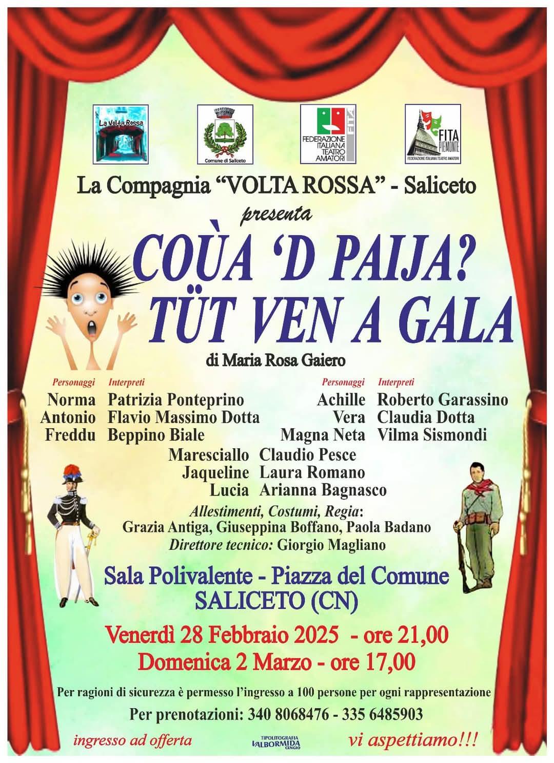 SALICETO. Venerdì 28 febbraio “COUA ‘D PAIJA TUT VEN A GALA” alla Sala Polivalente.