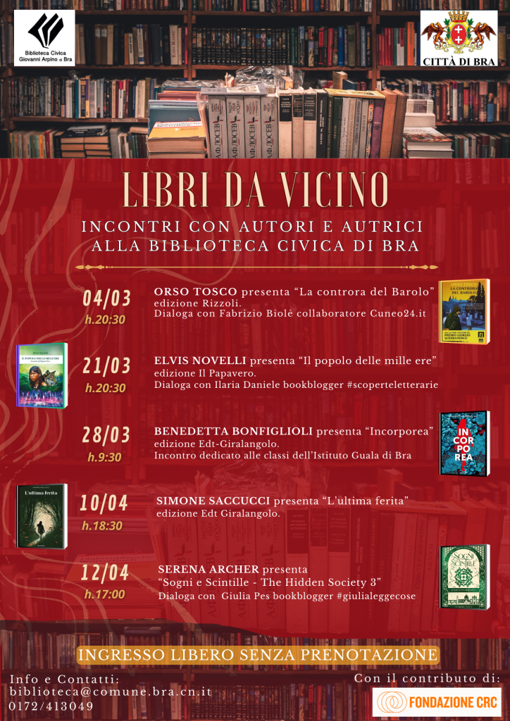 Il programma prosegue con l’incontro con Elvis Novelli, che il 24 marzo alle 20,30 presenterà “Il popolo delle mille ere” (edizione Il Papavero); a dialogare con lui la bookblogger Ilaria Daniele. Il 28 marzo sarà la volta di Benedetta Bofiglioli, che alle 9,30 presenterà “Incorporea” (edizione Edt-Giralangolo); l’incontro è dedicato alle classi dell’Istituto superiore Ernesto Guala di Bra.