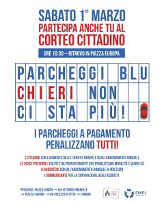 “Parcheggi blu, Chieri non ci sta più”. L’appuntamento è per sabato 1° marzo alle ore 10.30 in Piazza Europa, luogo di partenza della manifestazione Il corteo percorrerà via Vittorio Emanuele, Piazza Cavour, Via Palazzo di Città snodandosi fino all’arrivo innanzi al Municipio ove avranno luogo il raduno e le dichiarazioni di partecipanti e organizzatori.