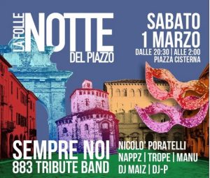 L’Assessorato agli Eventi e Manifestazioni ha previsto un programma che parte dal pomeriggio, con il classico carnevale dei bambini, a cura della Pro Loco, che proseguirà per tutta la serata con la musica dal vivo e DJ Set. Il preludio alla Folle Notte sarà, a partire dalle 20,30, la cover band degli 883: i ‘Sempre noi’ che suonerà sul palco ubicato ai piedi delle scale dell’omonimo Palazzo.