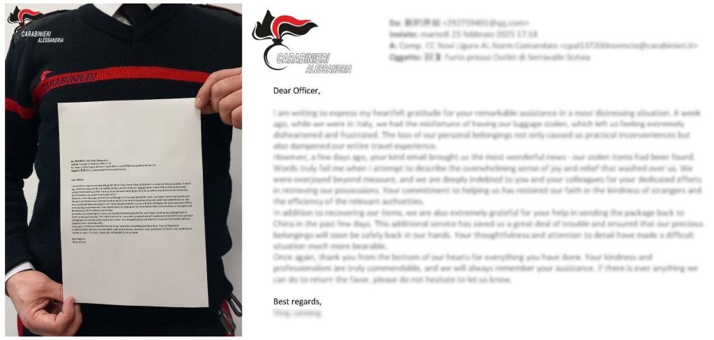 Derubati in Italia, sono costretti a rientrare in Cina senza bagagli. I Carabinieri arrestano i ladri e recuperano la refurtiva, poi spediscono valigie ed effetti personali a Shangai. La famiglia cinese ringrazia con un’accorata mail.