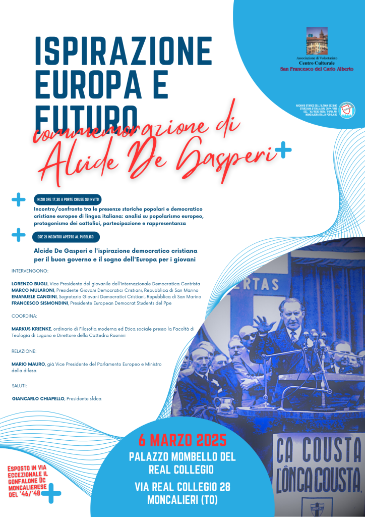 Giovedì 6 marzo, alle ore 17,30 a porte chiuse, su invito (da richiedere via mail), “incontro/confronto tra presenze storiche popolari e democratico cristiani europee di lingua italiana: analisi su popolarismo europeo, protagonismo dei cattolici, partecipazione e rappresentanza”.Alle ore 21 aperto al pubblico “Alcide De Gasperi e l’ispirazione democratico cristiana per il buon governo e il sogno dell’Europa per i giovani” Intervengono: Lorenzo Bugli, vice Presidente del giovanile dell’Internazionale Democratica centrista; Marco Mularoni, Presidente GDC Repubblica di San Marino; Emanuele Cangini, Segretario GDC Repubblica di San Marino; Francesco Sismondini, Presidente European Democrat Students del Ppe. Coordina: Markus Krienke, ordinario di filosofia moderna e etica sociale presso la Facoltà di Teologia di Lugano e direttore Cattedra Rosmini. Relazione: Mario Mauro, già Vice Presidente del Parlamento Europeo e Ministro della Difesa. Saluti: Giancarlo Chiapello, Presidente sfdca. Sede del convegno Palazzo Mombello del Real Collegio Carlo Alberto via Real Collegio 28, Moncalieri (To), sarà eccezionalmente esposto dall’archivio dell’ultima sezione sturziana operativa d’Italia, la popolare “Alfredo Rista” di Moncalieri, il gonfalone cucito nel ’46/’48.