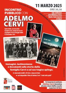 Martedì 11 marzo alle 20.30, nella sala conferenze della Biblioteca Civica “Nicolò e Paola Francone” di via Vittorio Emanuele II n.1 a Chieri, è previsto in occasione delle celebrazioni per l’80° Anniversario della Liberazione un incontro pubblico organizzato da ANPI, Lega del Sindacato Pensionati SPI CGIL e LIbera di Chieri con Adelmo Cervi, figlio di Aldo fucilato a Reggio Emilia con sei fratelli il 28 dicembre del 1943.