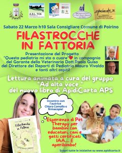 Sabato 22 marzo, alle ore 10, ApidiCarta Aps presenta, in sala consiliare a Poirino, il libro ʺFilastrocche in fattoria“ di Chiara Comollo e Francesca Aloi, una storia in rima completamente illustrata e dedicata ai più piccoli e alle loro famiglie, realizzata nell’ambito del progetto ʺQuesta pediatria mi sta a cuoreʺ.