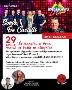 Correva l’anno 2000, quando a Chieri si esibì “l’orchestra di liscio di Omar Codazzi con Sonia de Castelli ”. Lo spettacolo, organizzato dalla Pro Loco della città, fu un gran successo.I due protagonisti, famosi per le loro splendide canzoni come,”Dove mi porta la Musica”, “Avevo un moroso”, “Io amo te”, “Il Pagliaccio”, “L’amicizia” e “Calice amaro” portarono la loro musica e fecero così ballare, sulle loro note di liscio, tanti chieresi.La Pro Loco di Chieri, in onore dei 25 anni passati, ha deciso di partecipare alla trasmissione televisiva “Ballando Le Cupole” martedì 29 Aprile che vede proprio Omar e l’orchestra di Sonia de Castelli come ospiti. La serata sarà trasmessa sul canale di Telecupole, 11 del digitale terrestre e registrata a Cavallermaggiore in provincia di Cuneo. La Pro Loco invita chiunque voglia partecipare ad unirsi!La quota di partecipazione, compresa di viaggio andata e ritorno in pullman, cena e spettacolo è di 40 euro a persona.Le prenotazioni possono essere fatte presso il bar della Bocciofila Chierese ed il 29, la partenza del pullman è prevista alle ore 19 da Piazza Europa .La Pro Loco è felice di offrire questa occasione per divertirsi, facendo un tuffo nel passato, e si augura di vedervi numerosi!