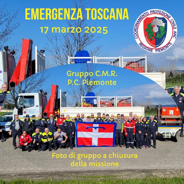 “Oggi 17 marzo 2025 si chiude la missione Colonna Mobile Regione Piemonte a Sesto Fiorentino (da sabato 15 e lunedì 17 marzo 2025). Grazie ai volontari ANC del Nucleo di Novara e del nostro stesso Coordinamento che hanno dato immediata disponibilità alla partenza con la CMR Piemonte, in supporto alla PC regionale. Un grazie anche a tutti i volontari dei nuclei della Regione Piemonte che si erano resi disponibili a partire, qualora la missione si fosse prolungata”