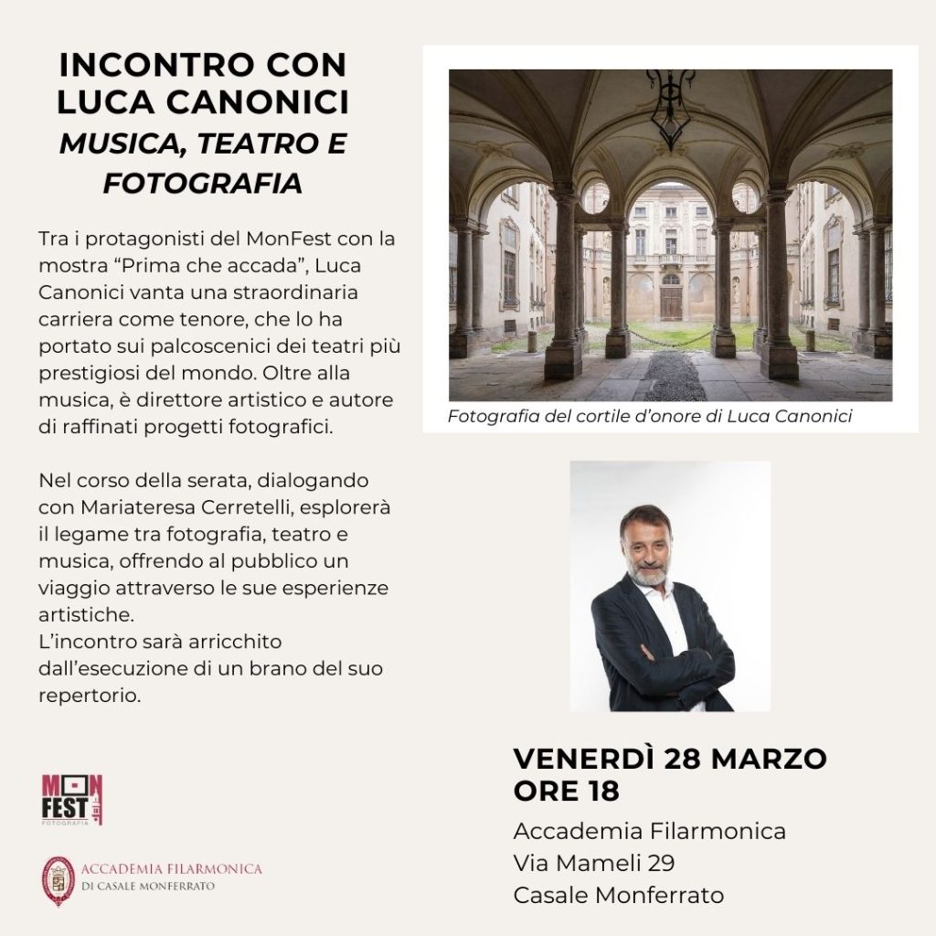 Venerdì 28 marzo 2025 alle ore 18,00, tra le iniziative legate al festival di fotografia MonFest, presso l’Accademia Filarmonica di Casale Monferrato, si terrà l’incontro con Luca Canonici dal titolo “Musica, Teatro e Fotografia”: un’occasione di approfondimento sul legame tra queste arti attraverso il racconto dell’esperienza artistica del relatore.
