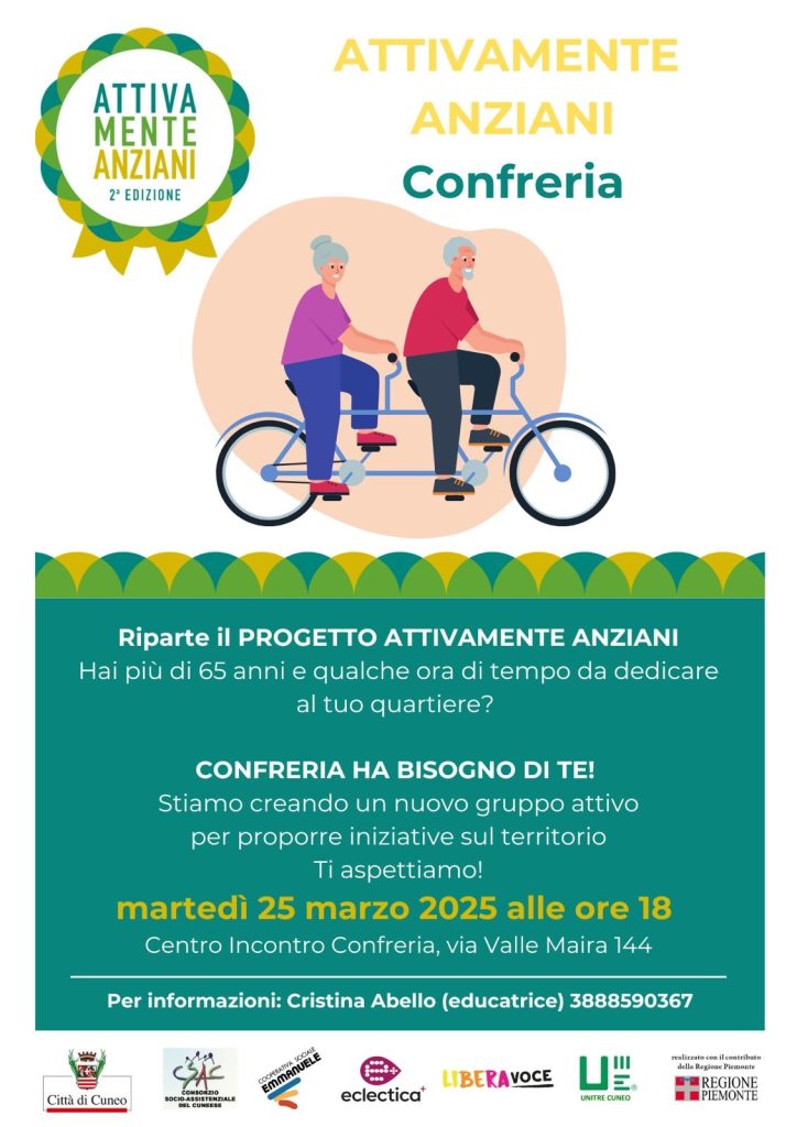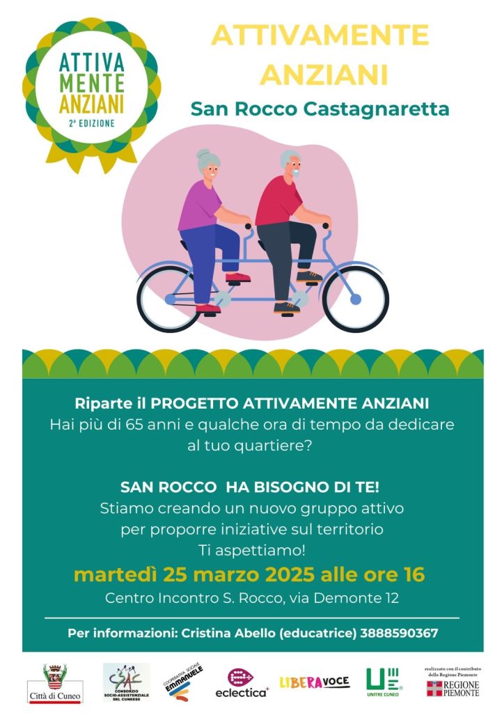 A Cuneo torna il progetto “Attivamente Anziani”, promosso dal Comune di Cuneo in collaborazione con la Cooperativa Sociale Emmanuele, l’impresa sociale Eclectica+, il Consorzio Socio Assistenziale del Cuneese, l’associazione LiberaVoce e l’Unitre, con il finanziamento della Regione Piemonte.