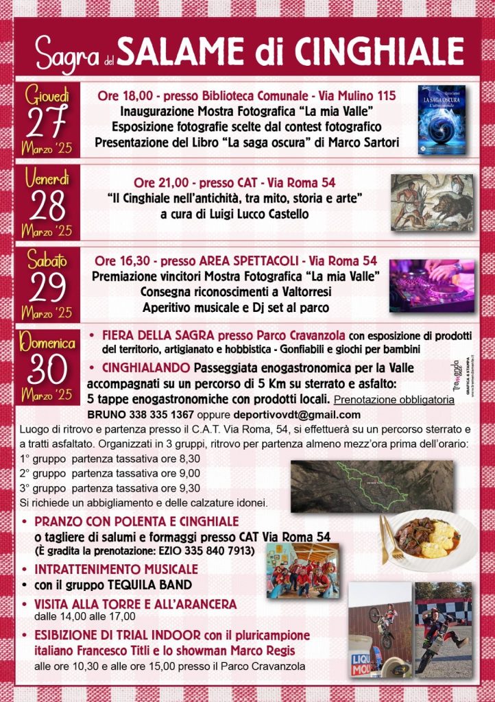 Comprende anche la passeggiata enogastronomica di 5 km “Cinghialando” il programma della ventesima edizione della Sagra del Salame di Cinghiale, in programma domenica 30 marzo a Val della Torre, con il patrocinio della Città metropolitana di Torino. La manifestazione si tiene nel parco Cravanzola e propone l’esposizione dei prodotti del territorio, enogastronomici, artigianali e artistici.