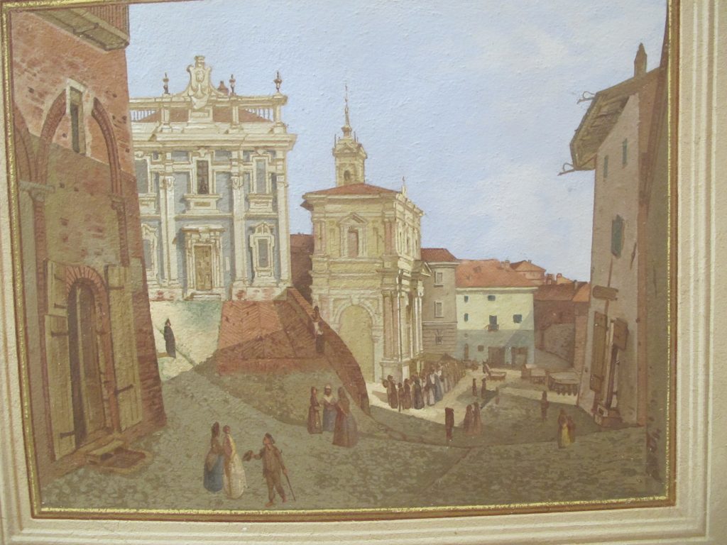 Non ricordiamo se quell’annuncio abbia suscitato reazioni di rilievo. Se, ad esempio, qualcuno si sia posta la domanda su chi potrebbe essere l’autore di quei dipinti. Domanda che invece oggi si impone, e che si pongono in primo luogo i proprietari della villa, la signora Elisabetta Lancellotti e il generale Ruggero D’osualdo, dopo aver constatato che due delle quattro vedute dipinte sulla volta del loro salotto, e precisamente quelle che riproducono San Bernardino e il Duomo, sono perfettamente identiche a quelle di due dei quattro quadri che, come abbiamo raccontato la settimana scorsa, nel 2017 alcuni benemeriti chieresi hanno acquistato da una galleria d’arte di Roma e donato al Comune e che sono tutti firmati: Gilli (cioè Alberto Maso Gilli).