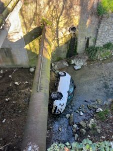 A Chieri, nella notte di domenica, una Fiat 500 per cause da accertare è uscita di strada in corso Torino e dopo un  volo di parecchi metri è finita in un rio.