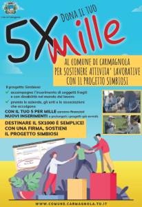 Per sostenere il progetto “Simbiosi” attraverso il 5×1000, è sufficiente indicare nella dichiarazione dei redditi il codice fiscale del Comune di Carmagnola: 01562840015.