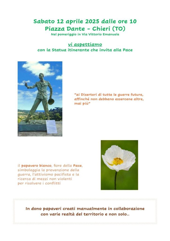 “La nostra è una iniziativa organizzata per sabato 12 aprile a Chieri (mattino in p.zza Dante, pomeriggio in Via Vittorio Emanuele) per portare un gesto concreto di Pace (doneremo papaveri fatti a mano nelle settimane scorse da varie realtà del chierese e non solo, compresi bambini e disabili). Ci accompagnerà una statua, che sta girando per l’Italia, che rappresenta un soldato che offre appunto un papavero bianco, simbolo di Pace. L’iniziativa è apartitica e senza alcuna “etichetta”.