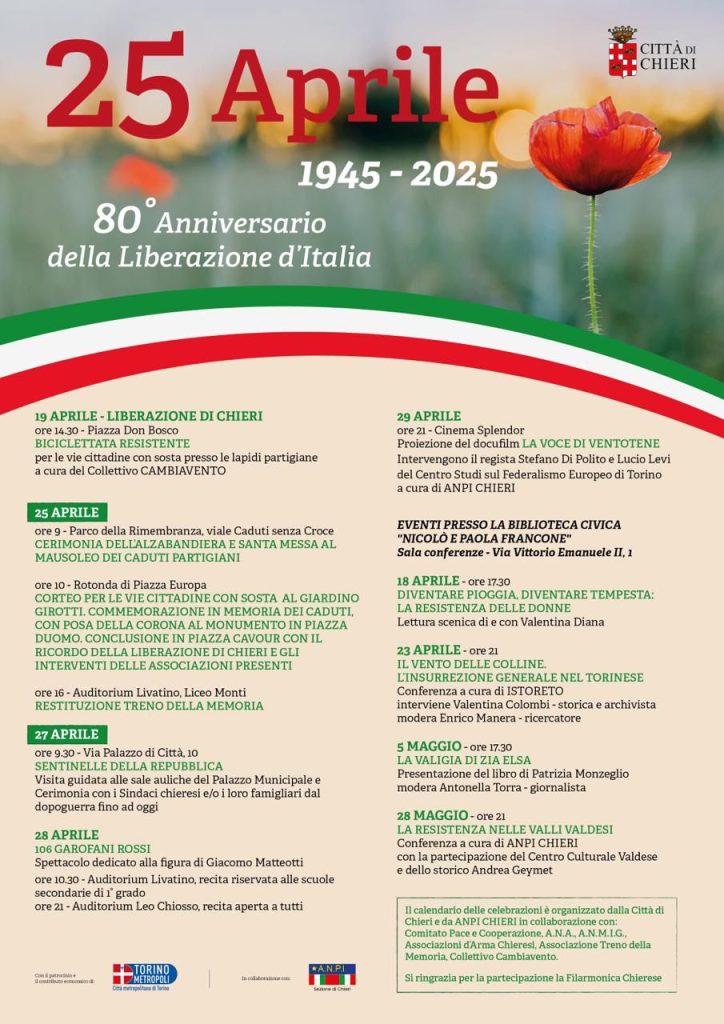 Il programma, condiviso con le diverse associazioni del territorio, prevede numerose iniziative, realizzate anche grazie al finanziamento che la Città di Chieri si è aggiudicato partecipando al bando della Città Metropolitana di Torino per le iniziative inerenti all’80° anniversario della Liberazione.