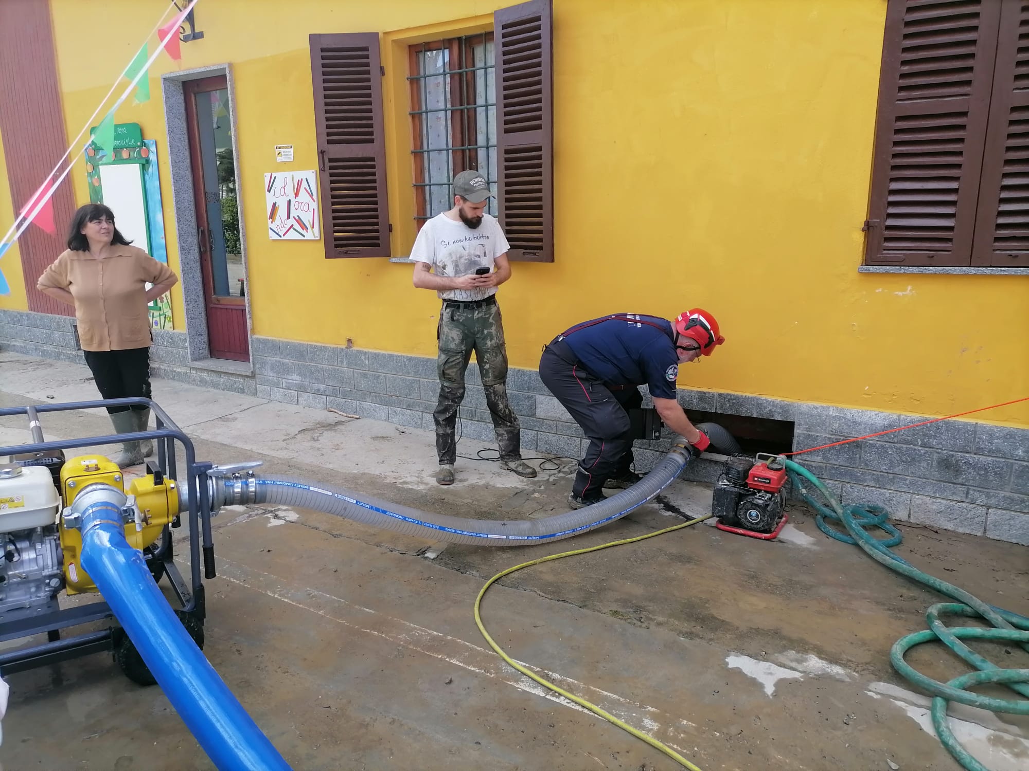 Sono una decina di volontari del A. N. C. che con Motopompe lavorano per liberare cantine e garage da acqua e fango .